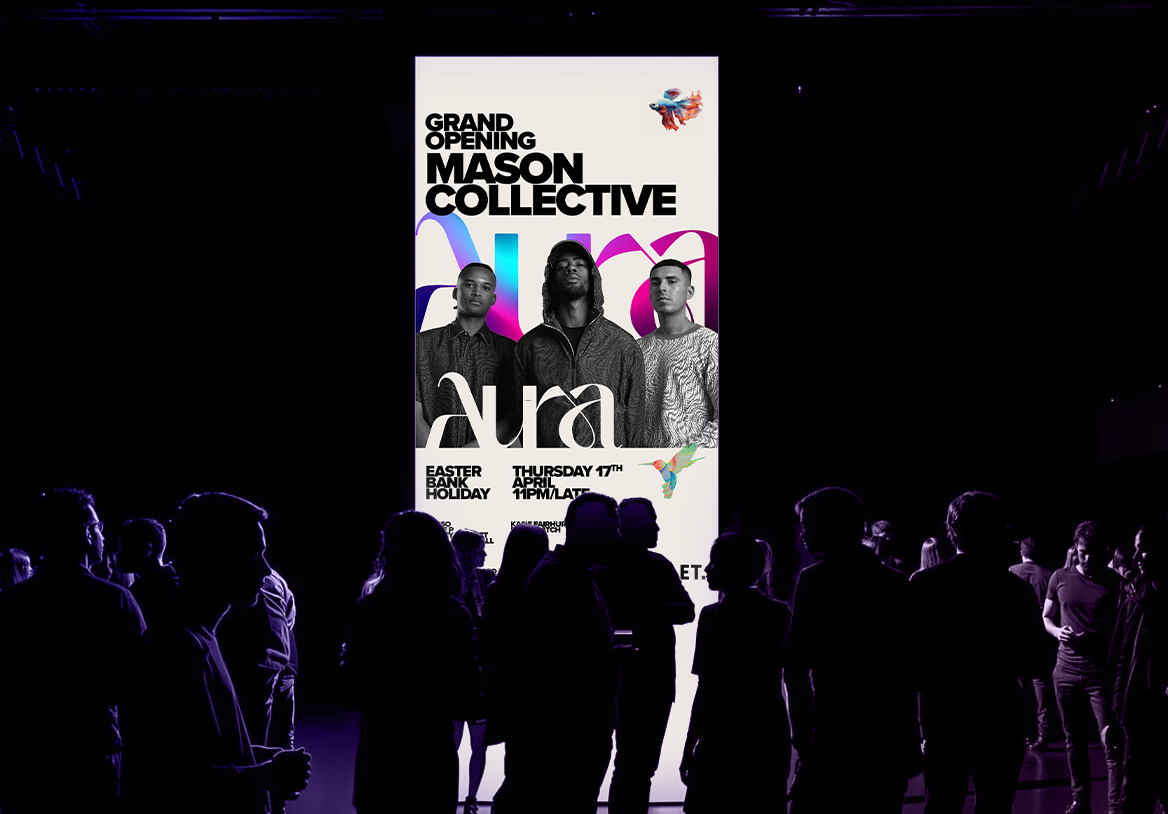 With the concept of ‘recharging your aura with energy’, we developed a corporate identity for Aura that reflected the luxurious spirit of the venue and was very much in line with the aesthetics of house music.