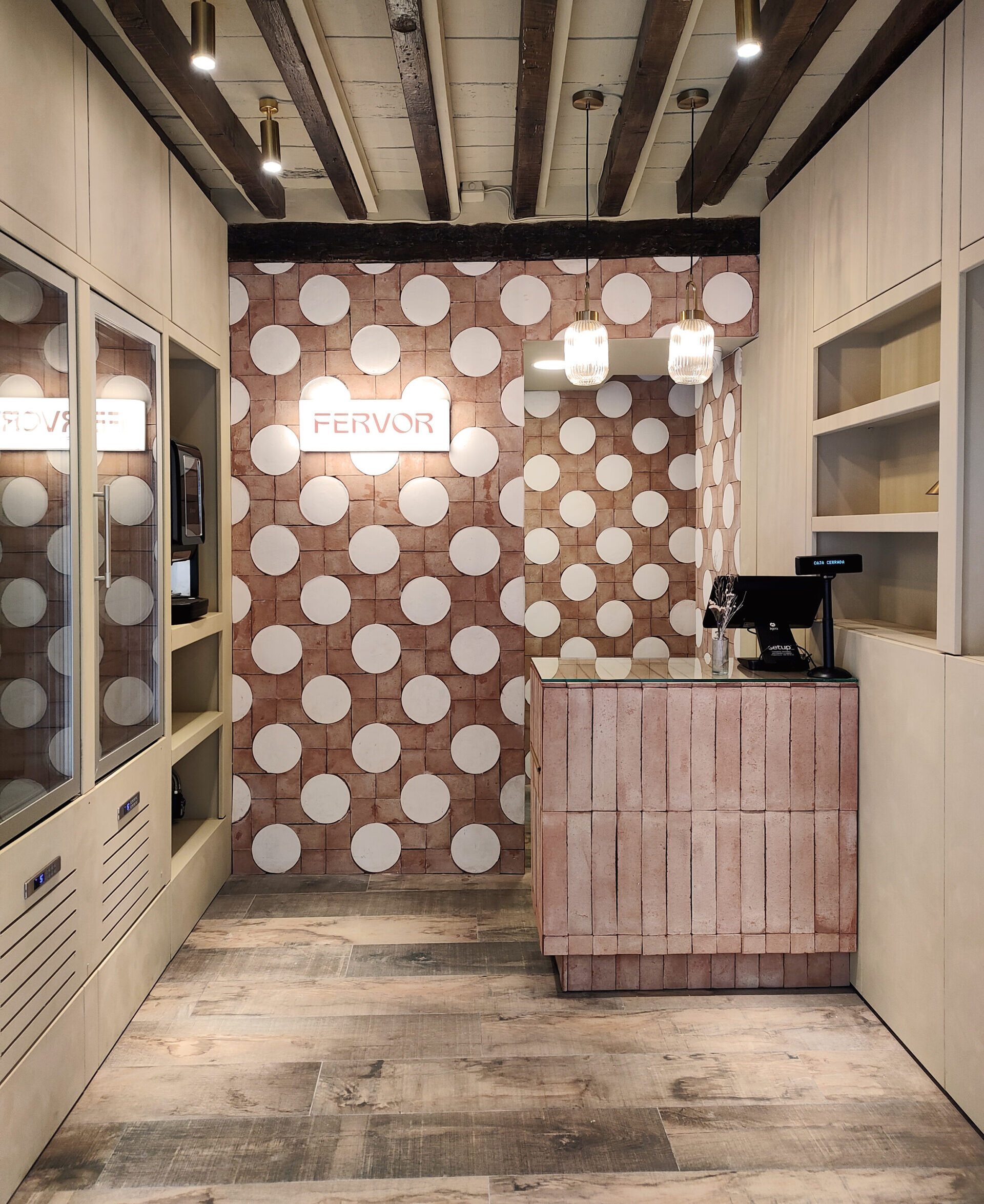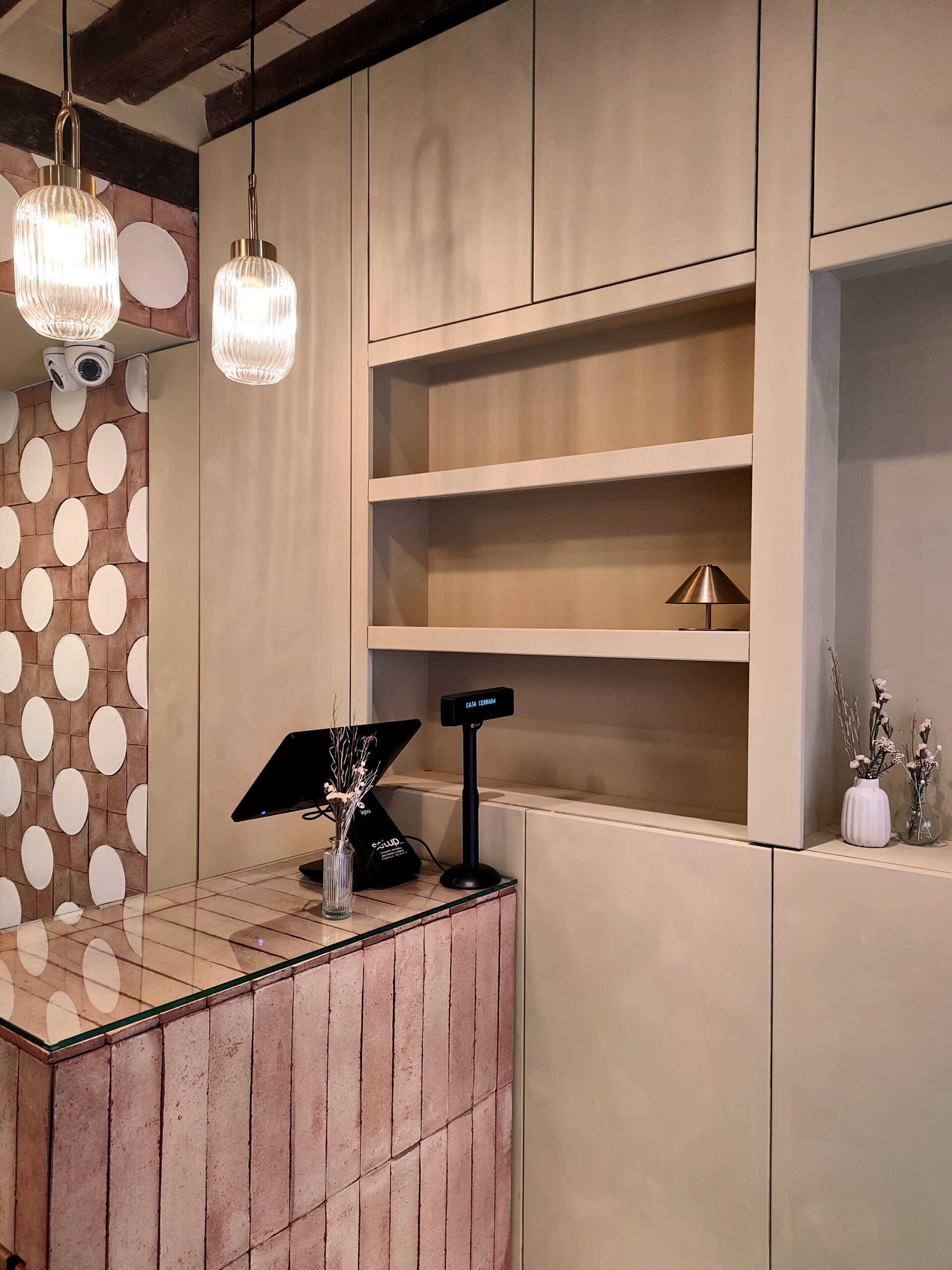 Se trata de un local dedicado a la venta de tartas de queso, y siempre tuvimos claro que el producto debía ser el protagonista. Por lo limitado del espacio, decidimos plantear una intervención muy sencilla y equilibrada, pensando que cada elemento contribuyera a la experiencia.
